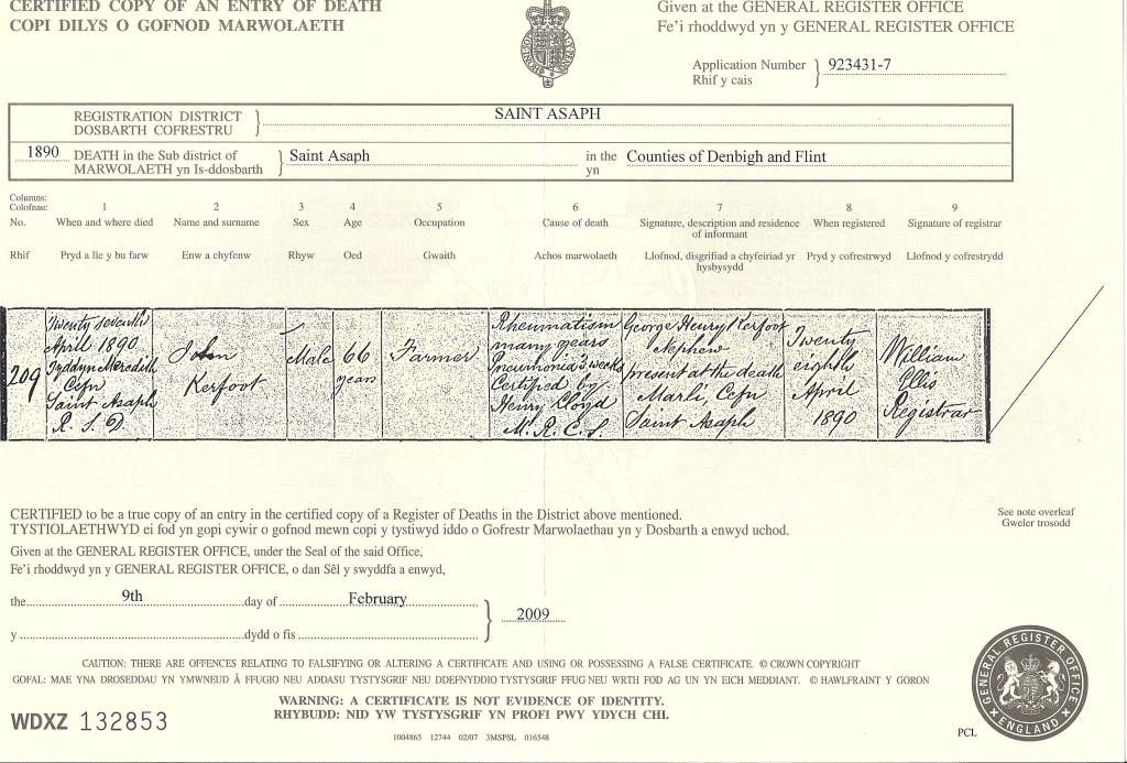 - General Register Office, Deaths index, St Asaph, Denbighshire, United Kingdom 1890; Vol 11b, QApr-May-Jun, p227.